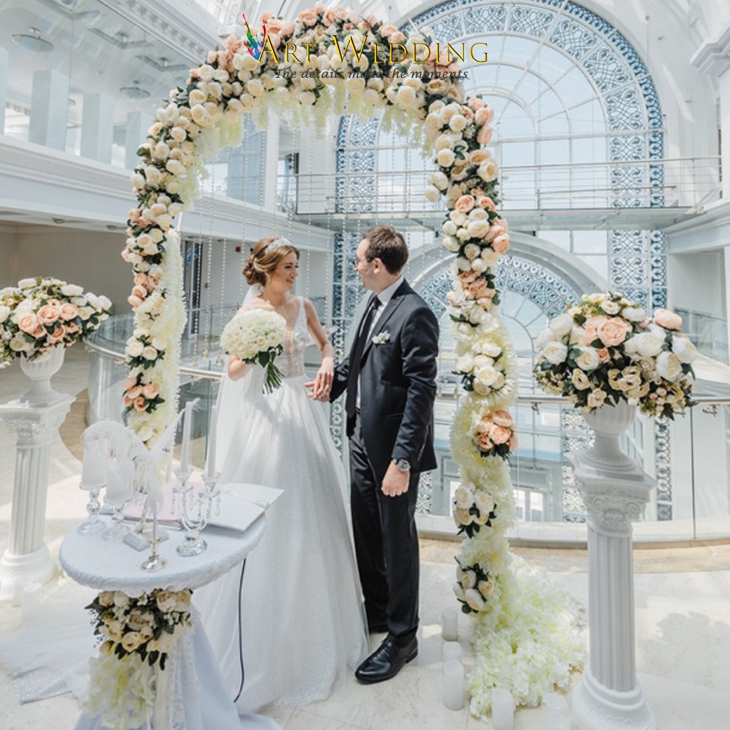 | עיצוב מקום הטקס (קישוט שולחן הרישום עם אביזרים שונים עם פרחי העונה טריים וקופסה לטבעות). | 150 |