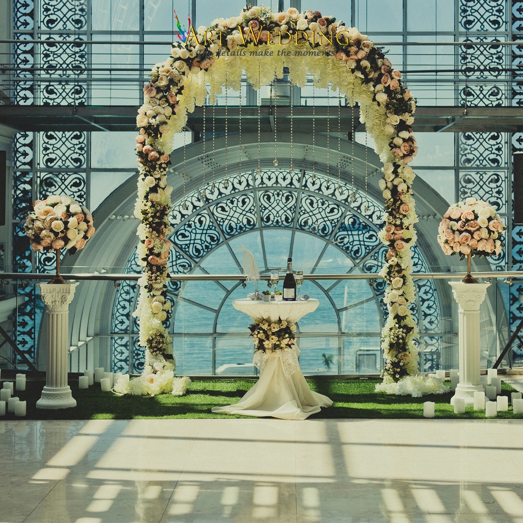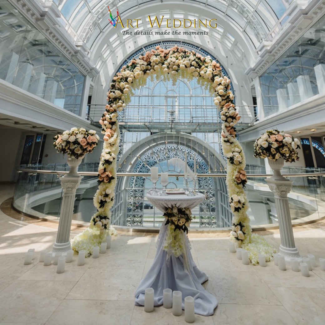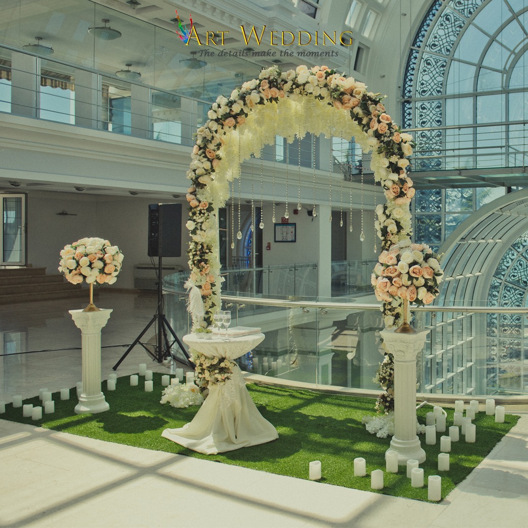 | Декорация места церемонии (Арка на выбор с тканью или органзой , живая сезонная зелень, искусственные цветы и зелень высокого качества. Столик для регистрации, декорированный композицией из искусственных цветов и различной свадебной атрибутикой. Ложе для колец.) | | | √ | √ |
