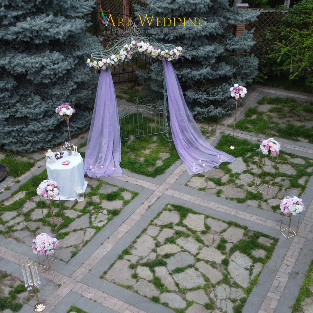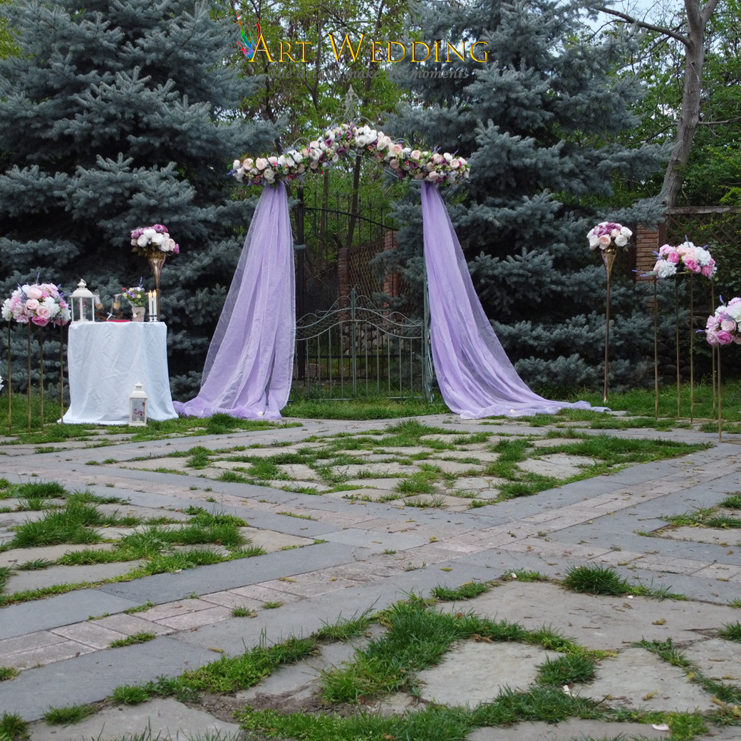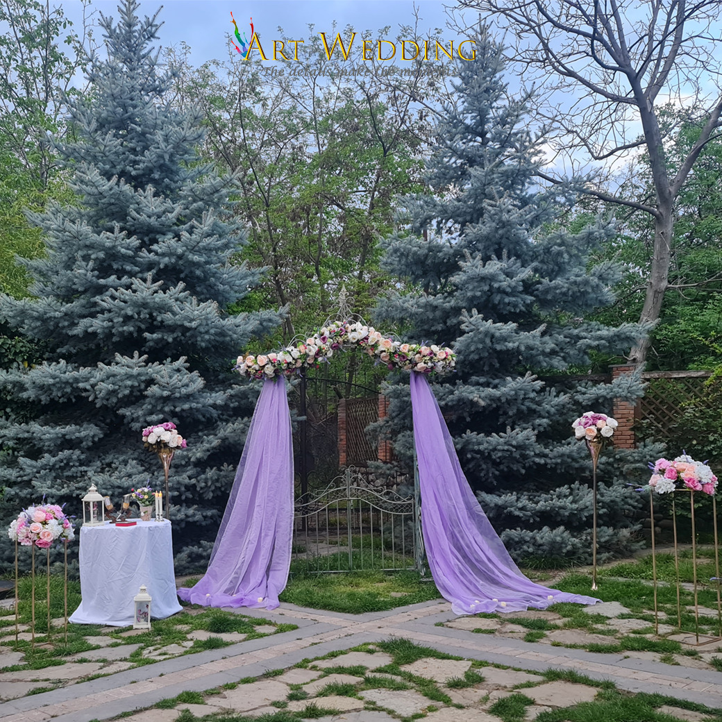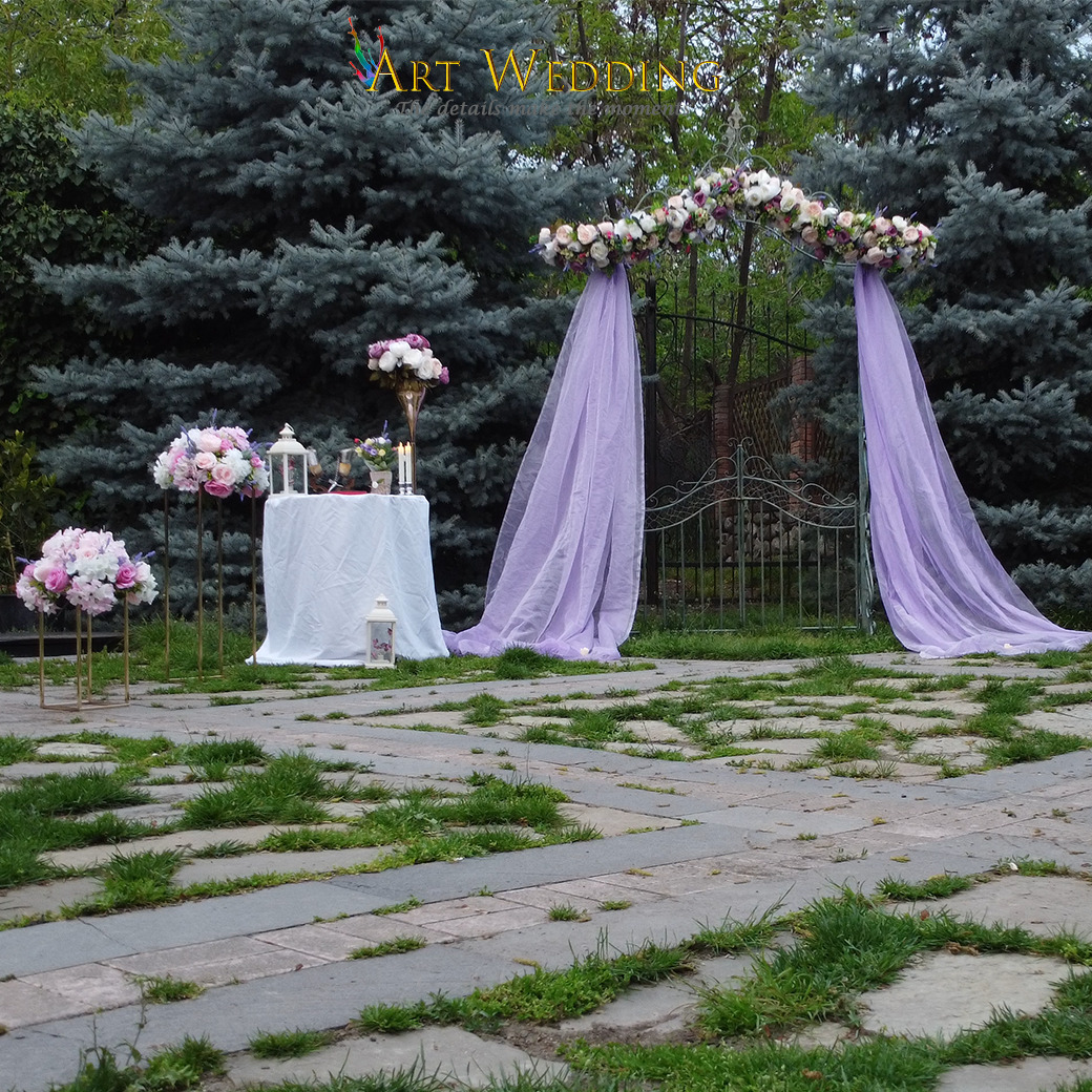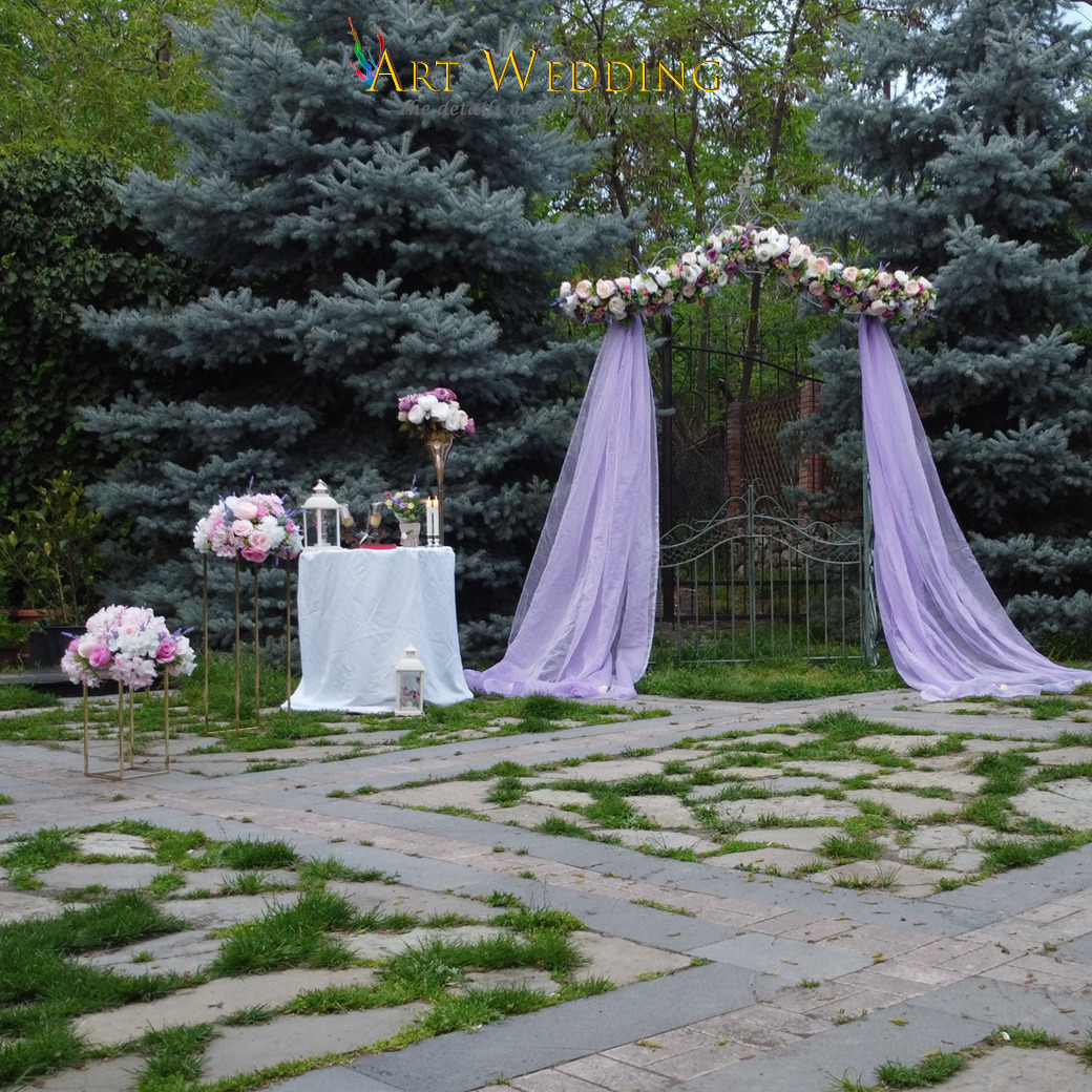 Декорация места церемонии (Арка на выбор с тканью или органзой , живая сезонная зелень, искусственные цветы и зелень высокого качества.  Столик для регистрации, декорированный композицией из искусственных цветов и различной свадебной атрибутикой. Ложе для колец.)350