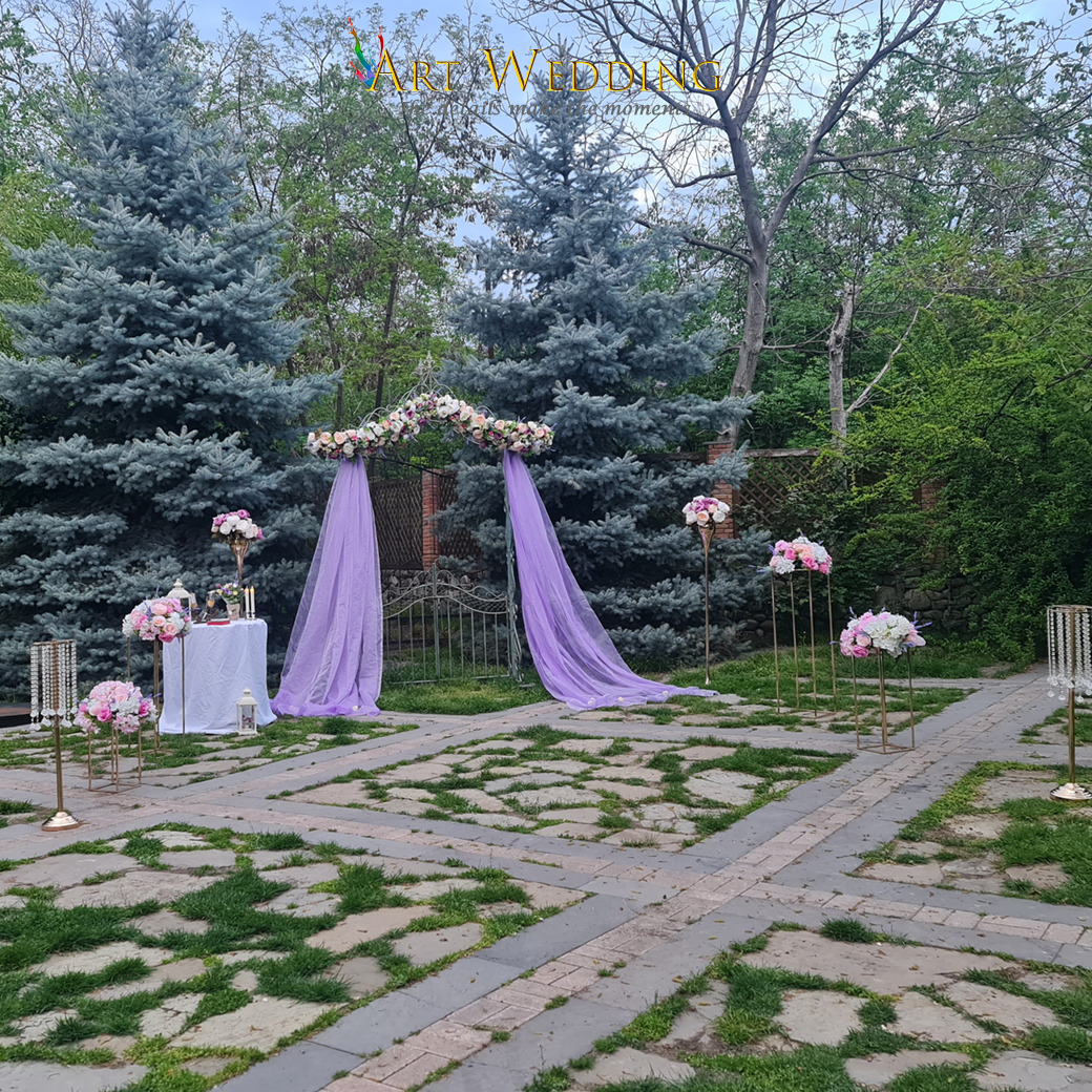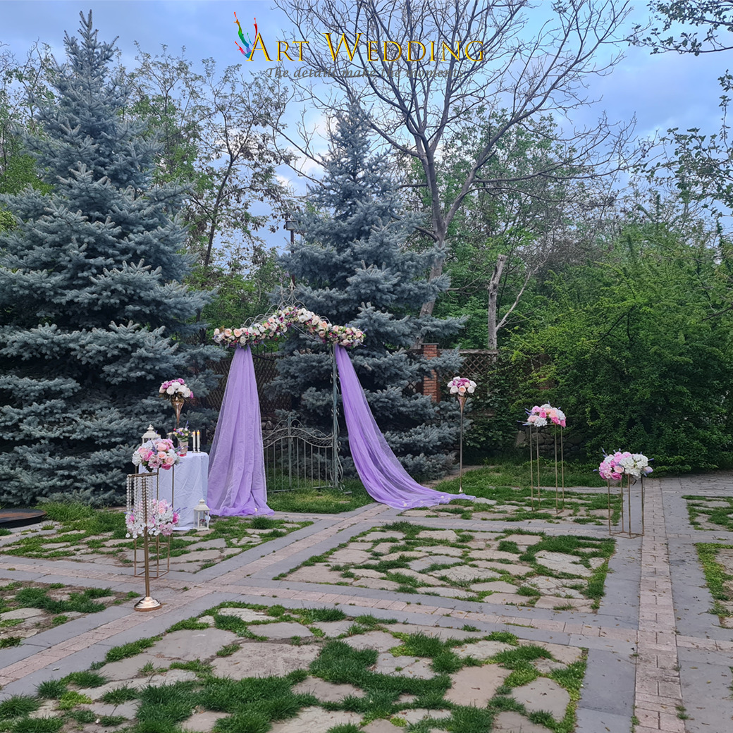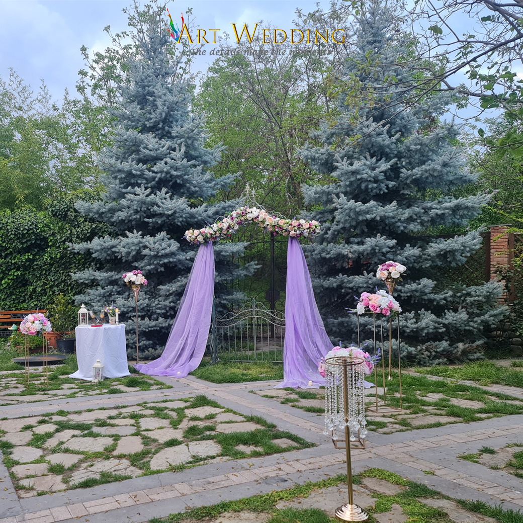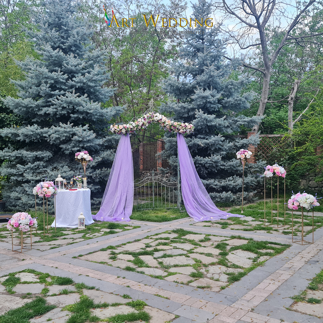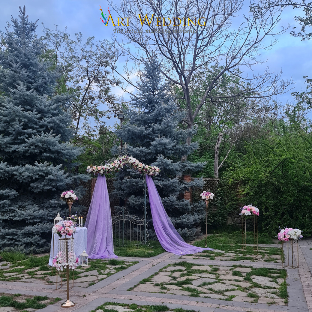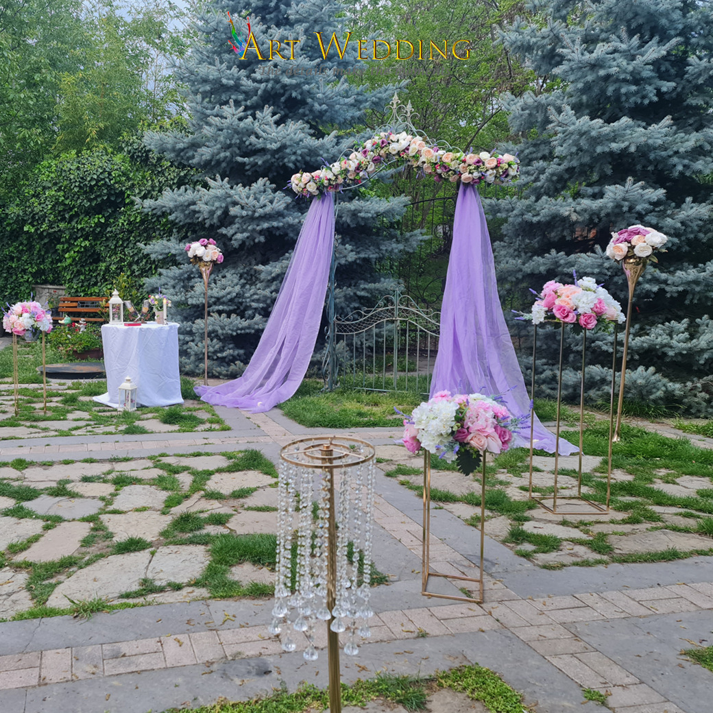 Декорация места церемонии (Арка на выбор с тканью или органзой , живая сезонная зелень, искусственные цветы и зелень высокого качества.  Столик для регистрации, декорированный композицией из искусственных цветов и различной свадебной атрибутикой. Ложе для колец.)350
