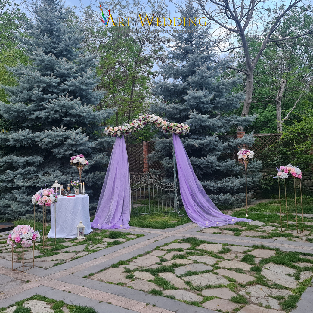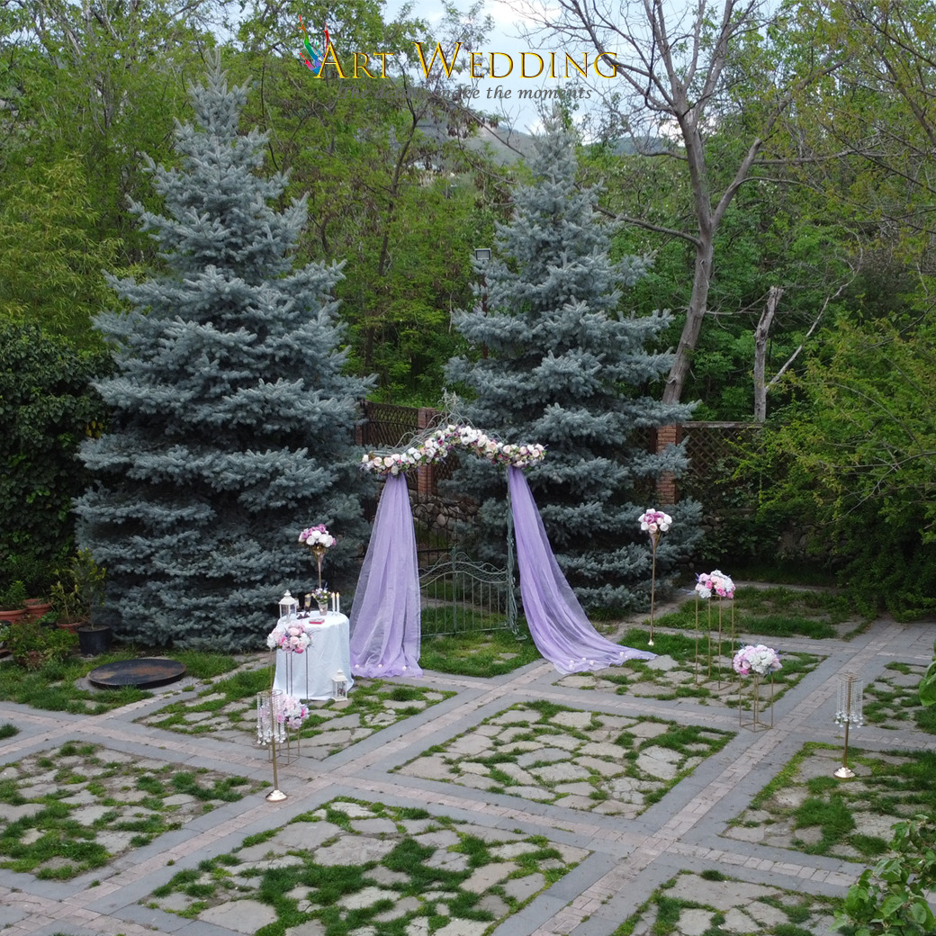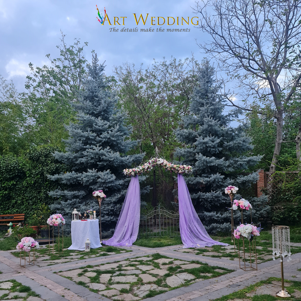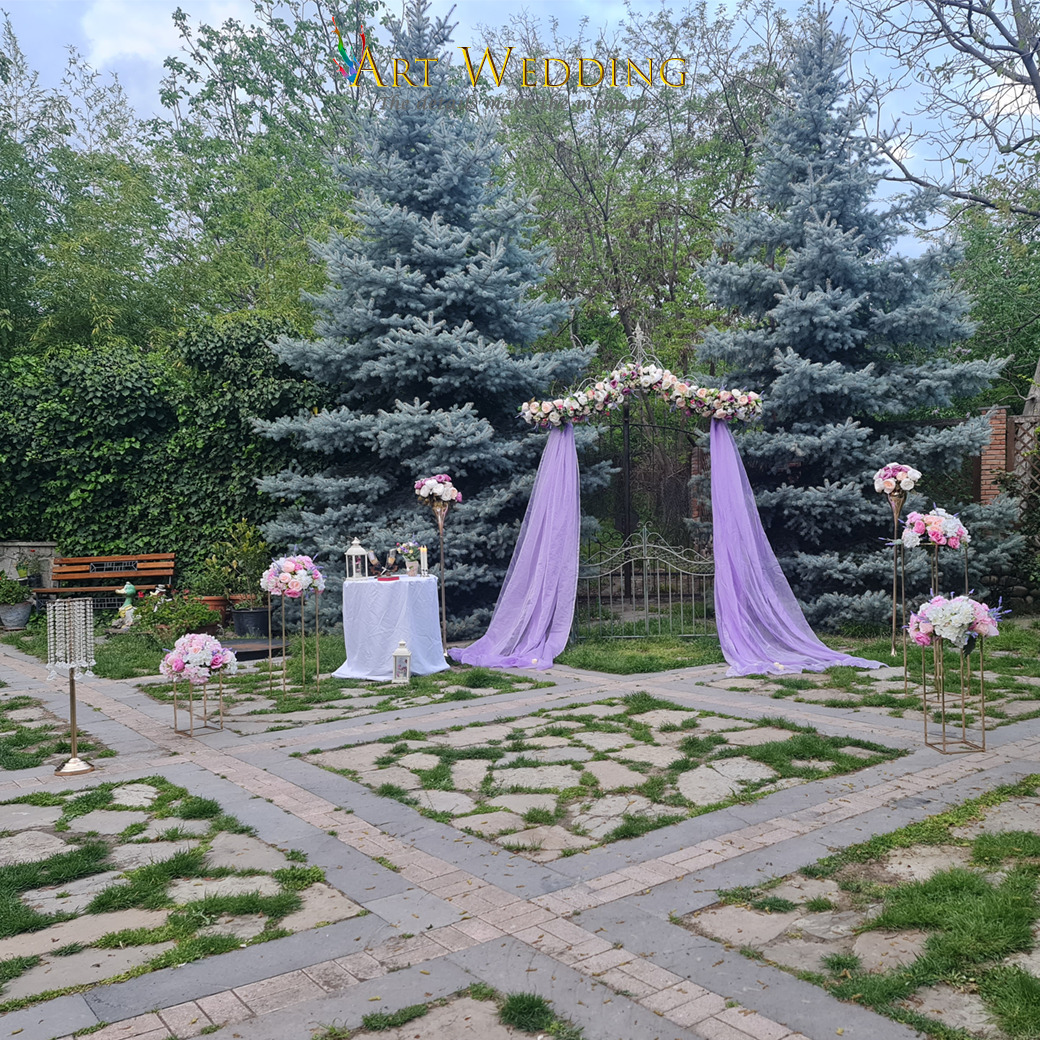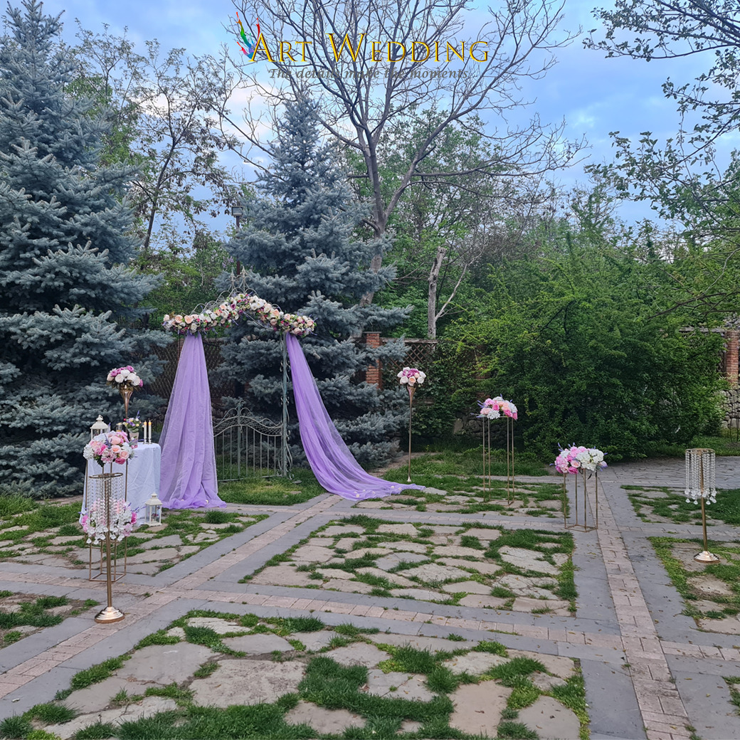 Декорация места церемонии (Арка на выбор с тканью или органзой , живая сезонная зелень, искусственные цветы и зелень высокого качества.  Столик для регистрации, декорированный композицией из искусственных цветов и различной свадебной атрибутикой. Ложе для колец.)350