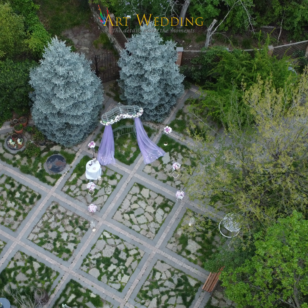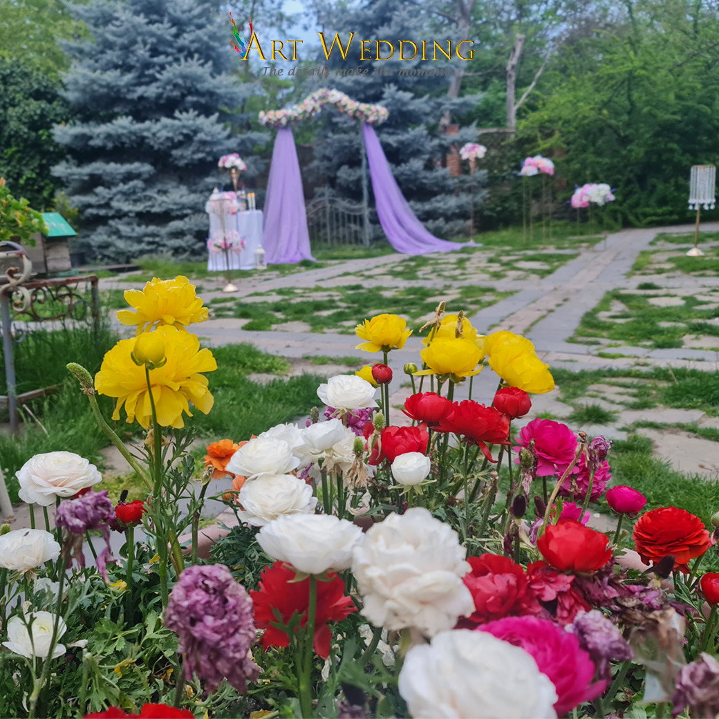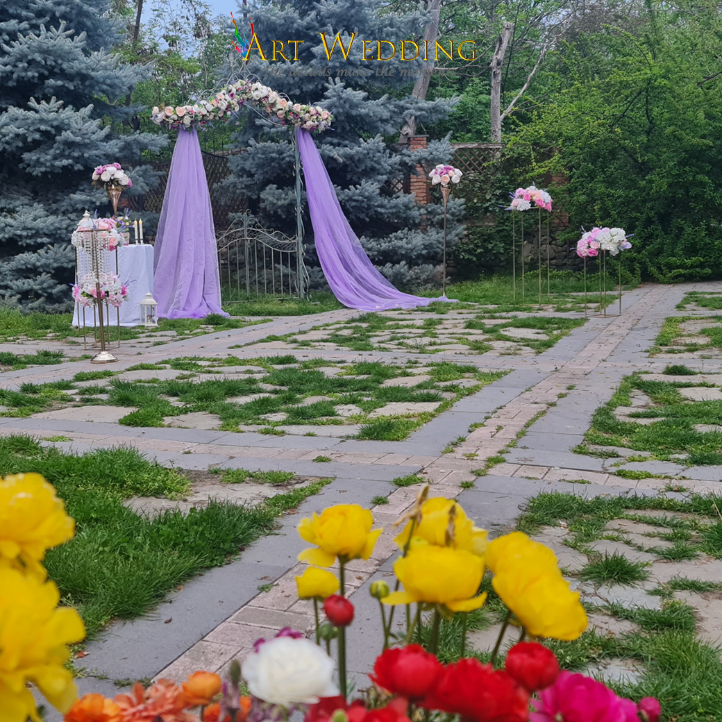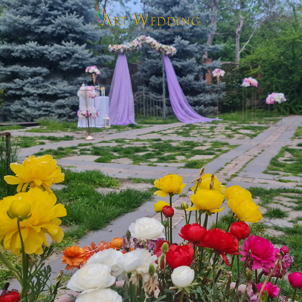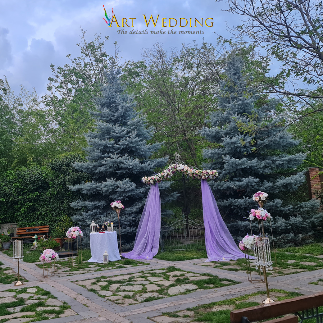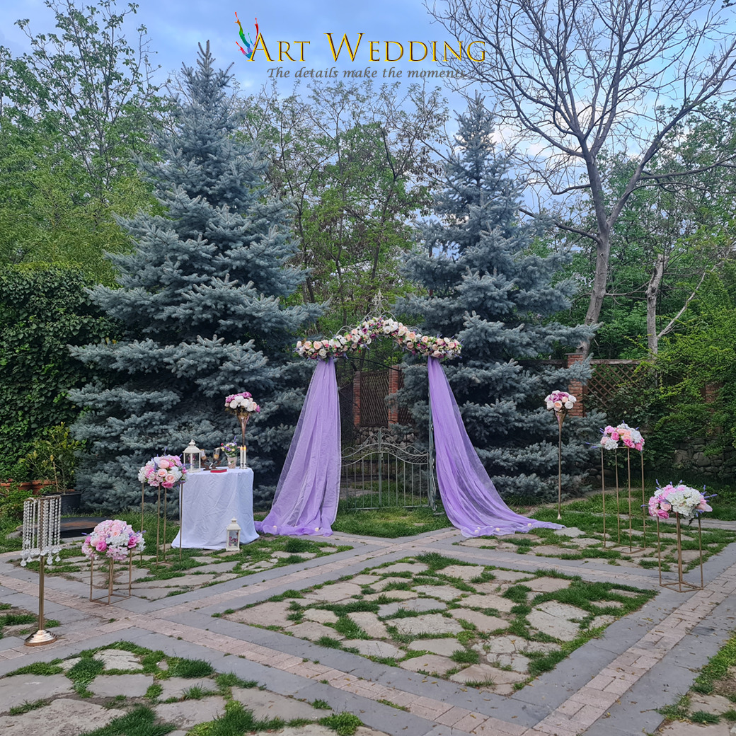 Декорация места церемонии (Арка на выбор с тканью или органзой , живая сезонная зелень, искусственные цветы и зелень высокого качества.  Столик для регистрации, декорированный композицией из искусственных цветов и различной свадебной атрибутикой. Ложе для колец.)350